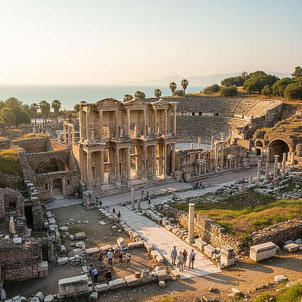 Kusadasi sits on the Aegean coast of western Turkey, and for anyone drawn to art and culture, it unlocks one of the most extraordinary concentrations of ancient civilization on the planet. Just 3 kilometers from the city center lie the ruins of Ephesus — once the second-largest city in the Roman Empire, home to over 250,000 people and one of the Seven Wonders of the Ancient World, the Temple of Artemis. Walking the marble-paved Curetes Street today, you can still see the ruts carved by Roman chariot wheels.